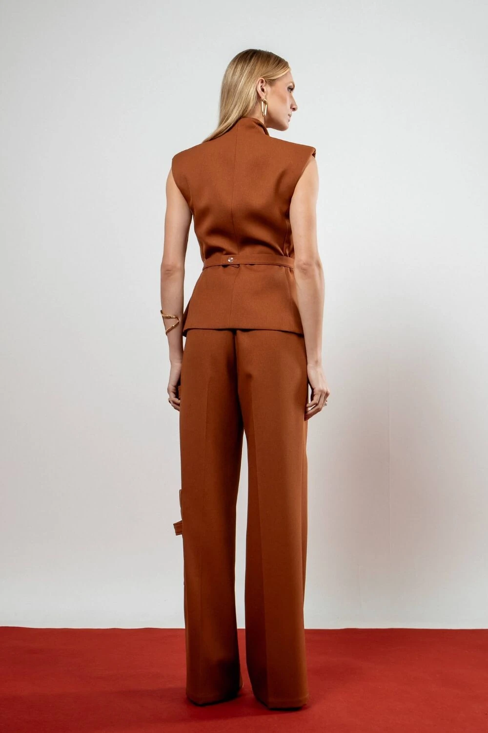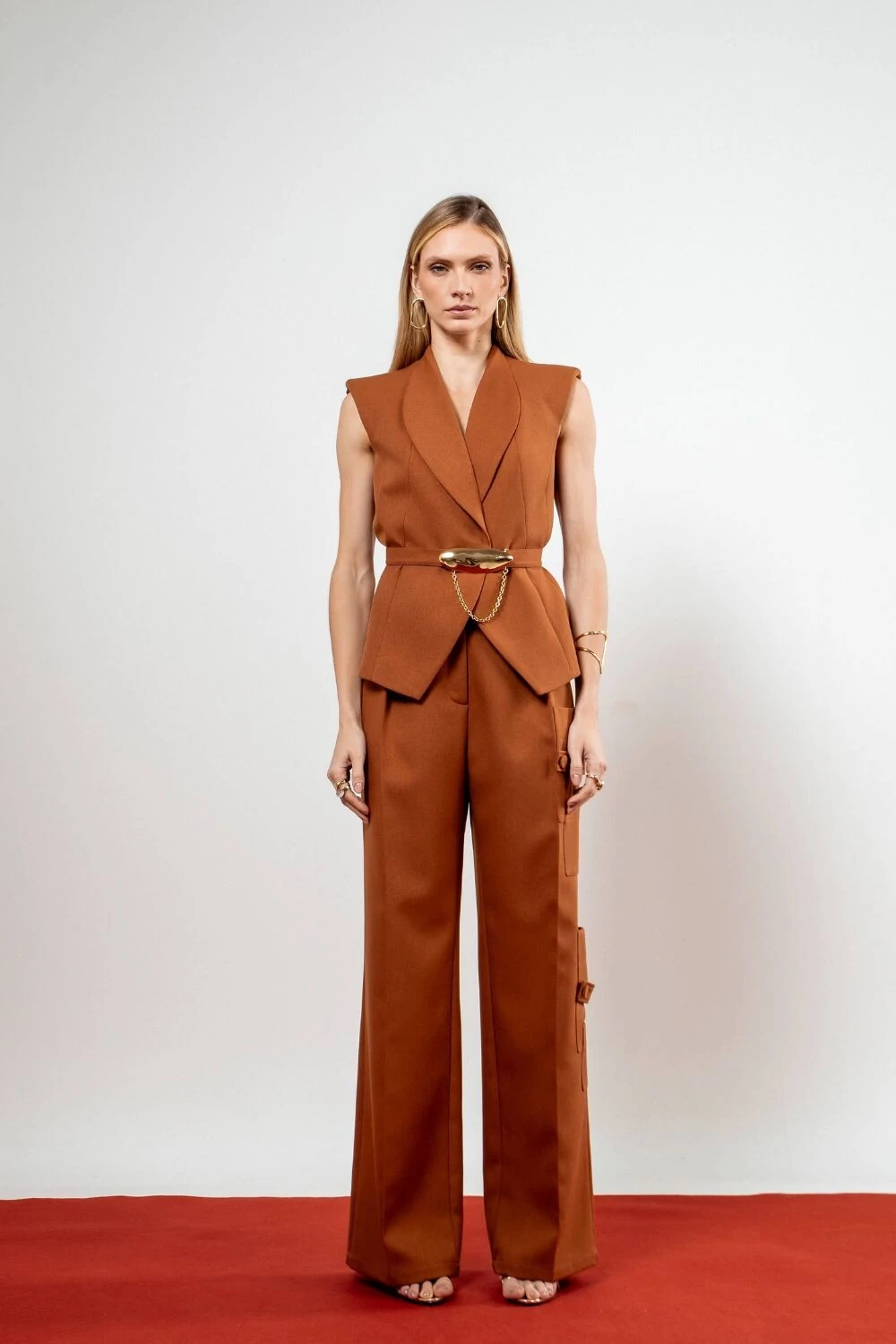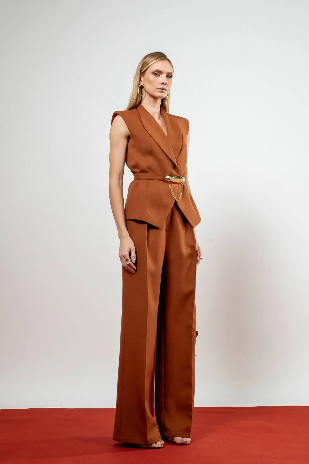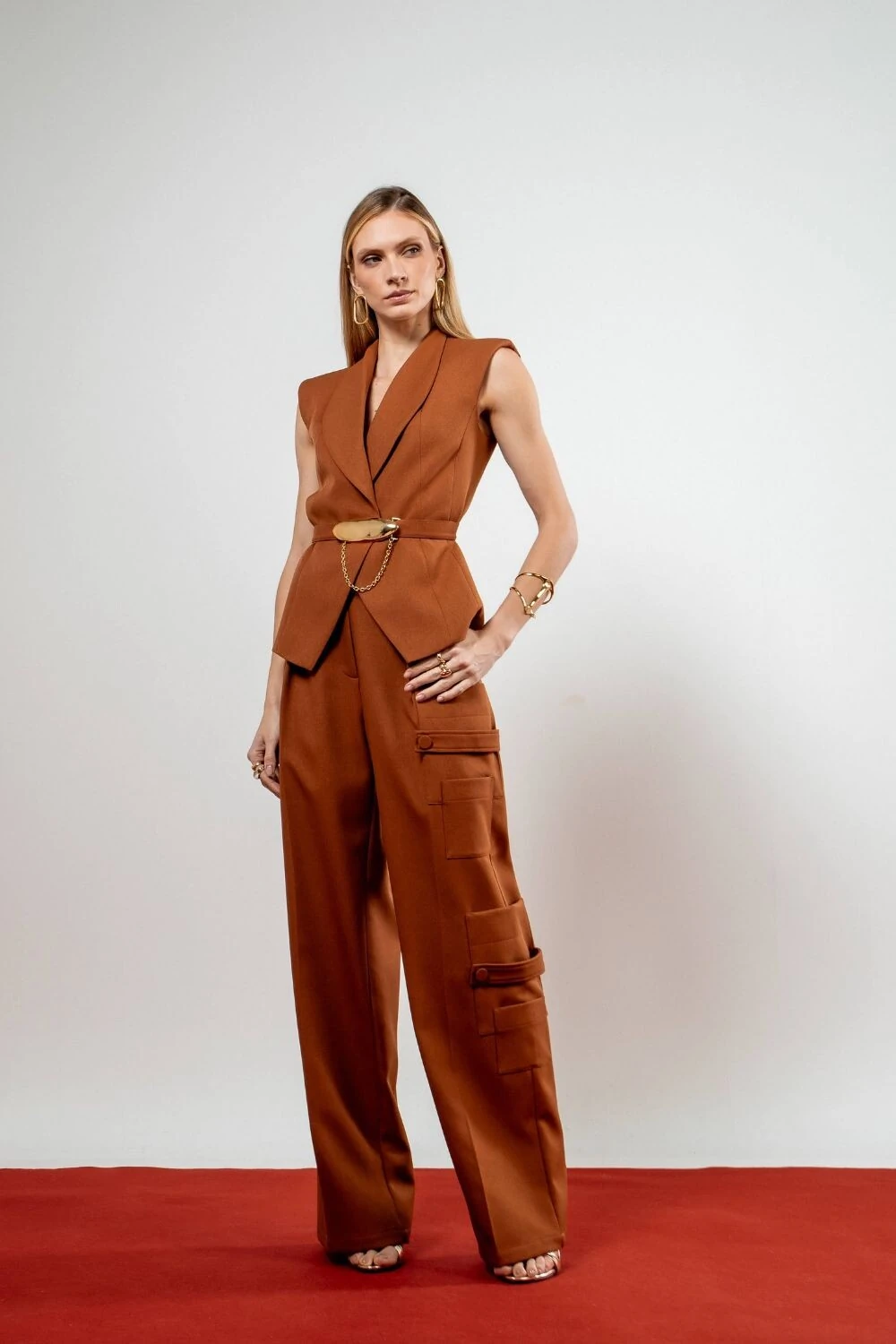Macacão Frente única Gola Assimétrica e Calça Com Pregas