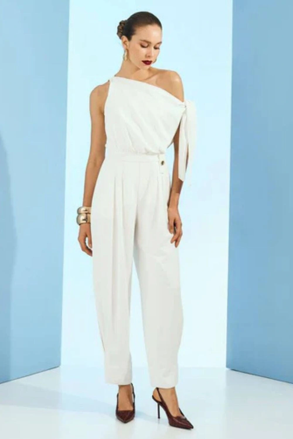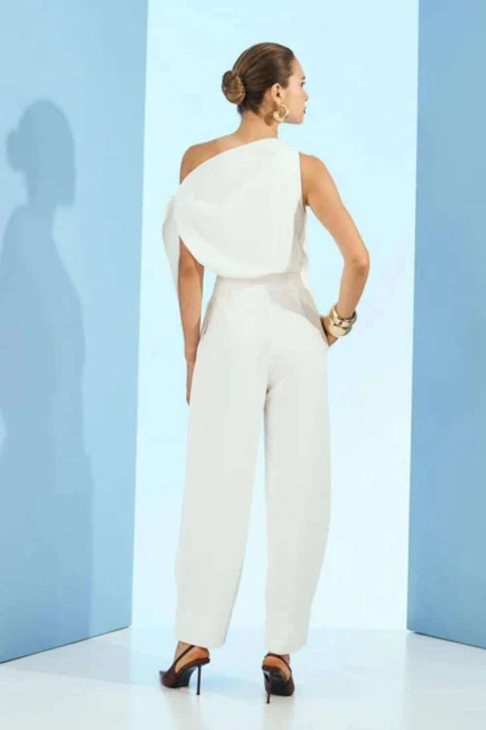 Macacãoem tecido leve de alfaiataria com toque acetinado. O modelo de um ombro só, com amarração lateral em laço, traduz elegância contemporânea e feminilidade sutil. A parte superior apresenta drapeado fluido que valoriza o colo, enquanto a calça de caimento reto com pregas frontais alonga a silhueta com sofisticação. O abotoamento lateral e o acabamento preciso reforçam o caráter premium da peça — uma escolha versátil e refinada, perfeita para ocasiões que pedem leveza e impacto.