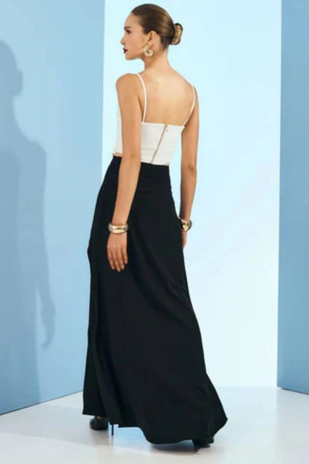Top de alças finas com corpo drapeado em malha estruturada. O caimento ajustado realça a silhueta com elegância, enquanto o drapeado frontal adiciona textura e movimento. A tonalidade clara traz contraste e luminosidade ao look, resultando em uma composição moderna, leve e sofisticada. Ideal para equilibrar produções de impacto com toques sutis de feminilidade.