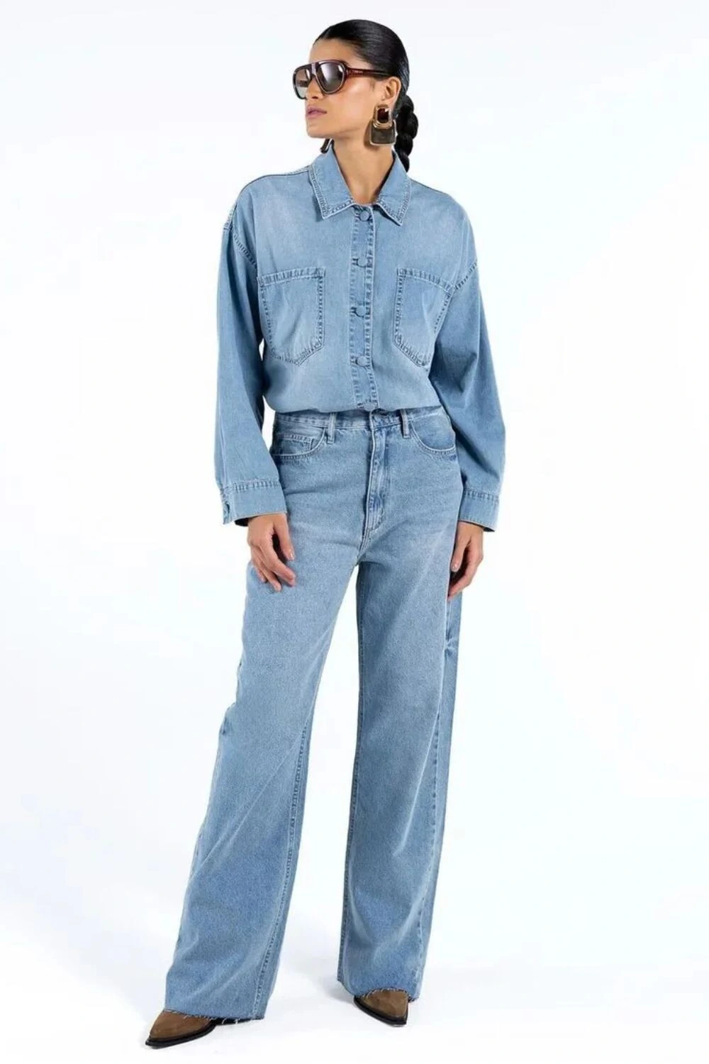 Conjunto Jeans Calça Barril e Colete Manga Dobrada Faixa