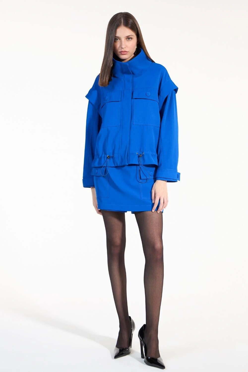 -40%Conjunto Vestido Curto Evase e Blazer Bicolor Alongado